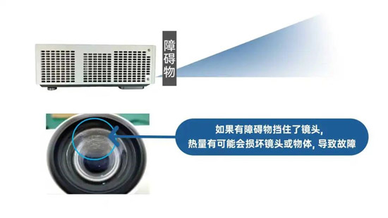 便携式投影机经常被应用于会议室、教室等场合,为人们的会议研讨和教育教学带来清晰的影像,提供方便。然而,在这些场景中,由于安装方式和投影需求的不同,投影机可能会被放在桌面、地面等与人距离较近,可能产生“亲密接触”的位置。在这时,会比较容易出现遮挡了投影机镜头的情况。比如在会议、培训期间,中场休息和散会时,人们停留在投影机镜头前讨论或聊天;还有可能有人随手把一本书或水杯放在了投影机镜头前等等。一些不经意间的行为,遮挡了投影机的镜头,随着现在便携式投影机的亮度也有所提升,亮度越高产生的热量也就越大,如果镜头前上时间有遮挡物,使镜头热量集聚,即使镜头已经通过材料和设计可以耐高温,但这样的意外情况也难免可能会对镜头及内部器件产生不好的影响。