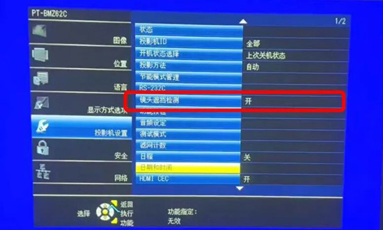 首先,我们来看一下镜头遮挡检测功能的设置。由于在一些场景中,投影机会安装在确保不会被遮挡到的位置,那么就无需镜头遮挡检测,因此该功能可以手动设置选择是否开启。设置的位置,在【投影机设置】菜单中的【镜头遮挡检测】选项,可以选择开启或关闭。