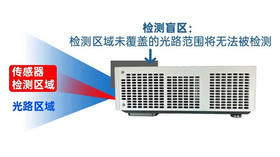 开启镜头检测后,位于投影机镜头下方的红外线传感器开始工作。它将检测镜头前近距离的位置是否有遮挡物。