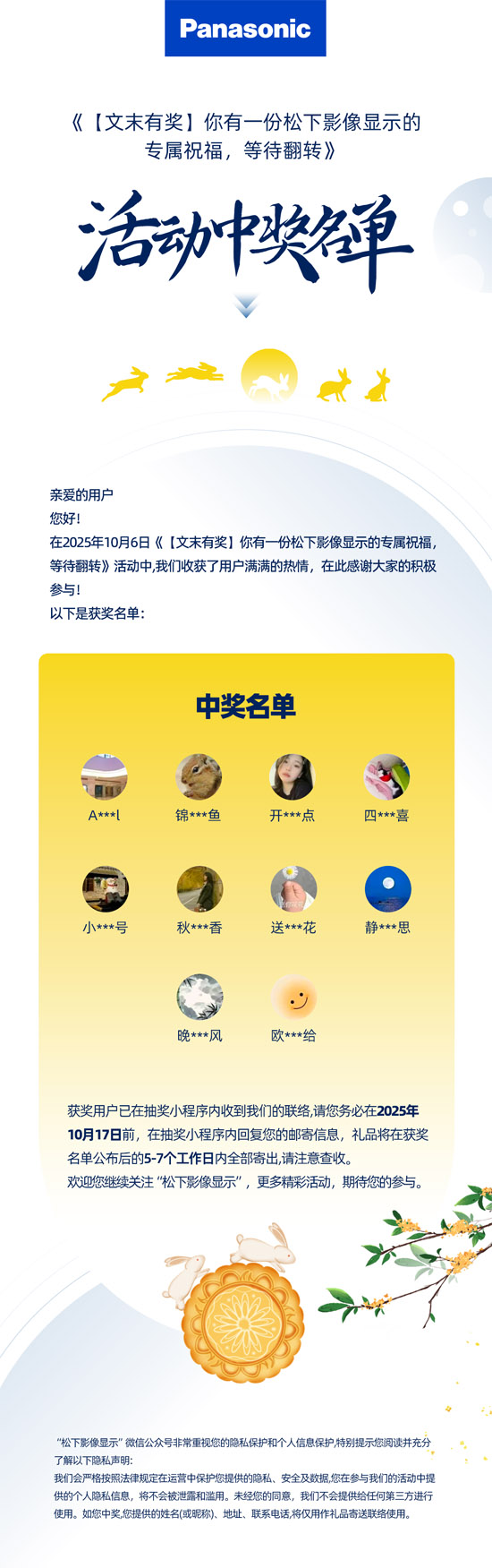 《【文末有奖】你有一份松下影像显示的专属祝福,等待翻转》活动中奖名单