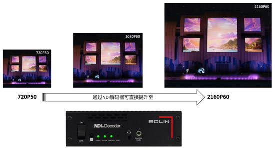 在与终端显示设备的适应性方面,保凌NDI解码器能够将来自SD530NX的高清NDI HX3画面在终端的高清或4K显示设备上播放,这是由于NDI解码器支持对不同分辨率(如720P50/1080P60/2160P60)自动兼容显示。不仅如此,NDI解码器还可以支持HDMI2.0和12G-SDI两种信号的输出以及NDI High Bandwidth和NDI HX3两种解码,达到“一机多用聚划算”的效果。