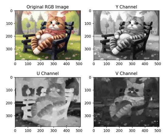 由于人眼对亮度的变化比较敏感,对色度的敏感度相对较低。我们举例来说明为什么人眼对Y分量更敏感。下图是通过程序把彩色图片中的Y/U/V三个通道分量提取出来的展示效果。
