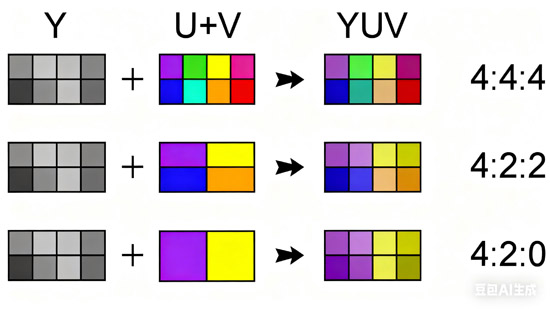 利用这一特性,YUV格式可通过减少色度分量采样来有效压缩数据量,在几乎不损失主观视觉质量的前提下,显著降低数据量