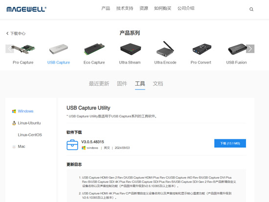 ·下载工具软件:首先访问美乐威官网,点击导航栏的技术支持”->“下载,找到与你采集棒型号对应的“USB Capture Utility V3”工具软件,并下载安装。