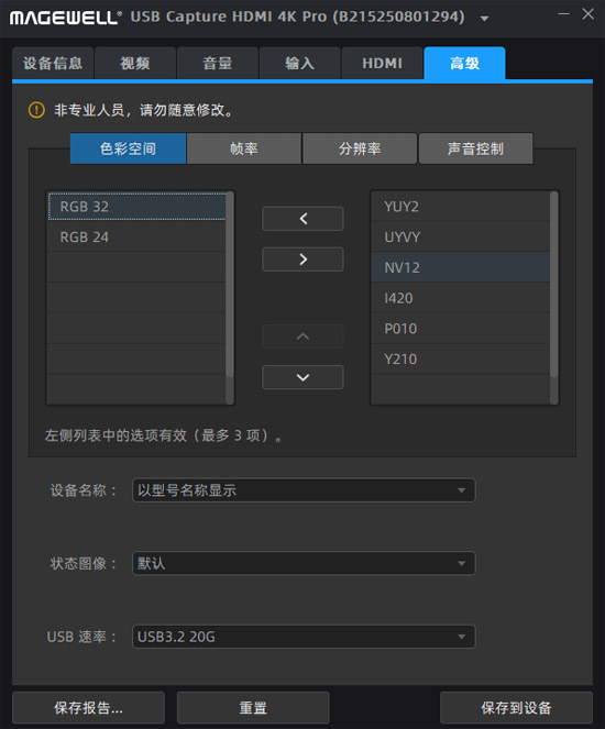 ·软件设置:运行“USB Capture Utility”软件。点击软件界面中的高级选项。在色彩空间设置区域,你会看到左右两栏。先将左侧存在的格式依次选中移动到右侧列表,再将右侧可选的“RGB24”“RGB32”格式依次选中并添加到左侧的列表中。
