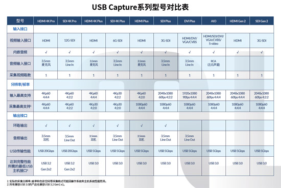根据上面两步确定的需求,再结合美乐威USB Capture系列所有型号对比表,查看不同型号接口和USB采集性能区别。