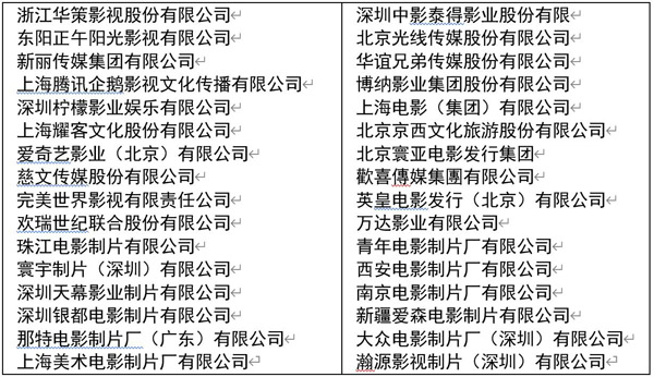 影视基地:横店影视城、西安电影制片厂、广州湾区影视城、深圳国家超高清视频创新中心、海丝厦门电影产业基地、长春国际影都、青岛东方影都、成都青年之光片场、扬州中国电世界、上海纪希片场、郑州新片场、珠影影棚、上海影视乐园、镇北堡西部影城、象山影视城、焦作影视城