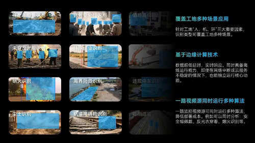围绕建筑工地核心要素,覆盖分析-识别-告警全流程,打造场景化定制AI算法实时识别工地场景安全行为规范。