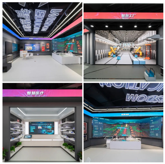 穿过时光隧道,来到独具特色的行业展示区。观众可以沿着一条长达90米连贯标题屏参观,从中感受智慧教育、智慧城市、数字化应用、智慧工厂、智慧医疗等前沿的科学技术,各个区域的技术成果精细完美地呈现在高清显示屏上。