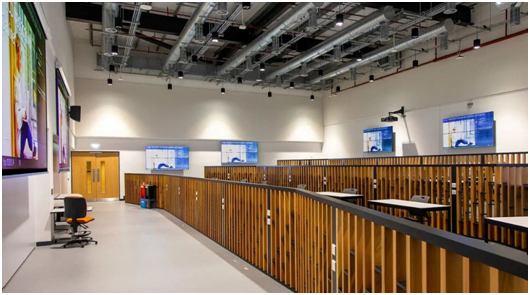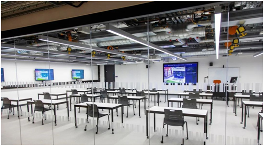 2 号融合场馆采用常规课堂与干实验室二合一的创新设计,成功将理论教学与操作应用完美结合。在理论教学区,7 个学生工作站都能与 2x2 的拼接墙联动,以增强可视性并优化协作 。场馆另一边为干实验室,这使得同学们能够在理论学习与实操应用之间自由切换,以加深对知识的掌握,并提升操作技能。