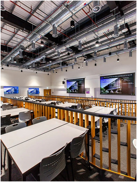 英国曼彻斯特大学工程校区(MECD) 全新建造的两幢大楼与原先的图书馆 (Oddfellows Hall) 相连接。楼内设有两层报告厅,4 个教学集群,超过 120 间会议室和教室(替代传统型教室),及 1 个大型互连场地(由 5 个大型教学区、独立实验室/讲习班、可分离式报告厅以及 1 间独特的课堂与干实验室二合一的融合场馆)构成。整个校区共有 5 幢大楼。该项目为其新增约 2,200 个教学、会议及社交空间,总面积达 80,000 平方米。