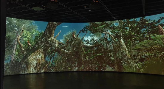 主入口大厅,4 台 DWU880-GS 以吊架安装,在 22 米弧幕上还原热河生物群远古生态。科视精准的色彩还原技术,游客一入馆即构建沉浸式时空氛围。