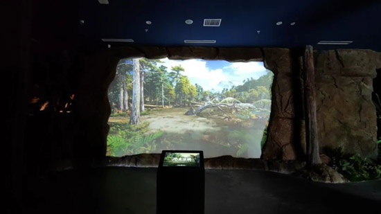 白垩纪主题区由 6 台投影机打造动态全景,搭配半透明纱幕投影区,由 1 台设备支持,以光影层次感呈现远古生态