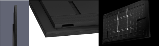 左:纤薄的机身设计;中:底部的内凹式提手;右:位于中心的VESA安装孔