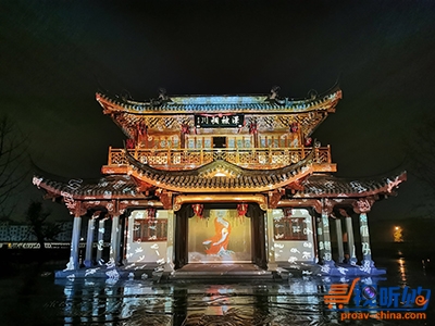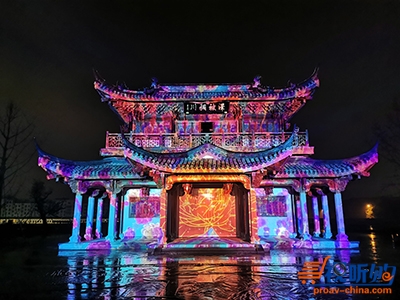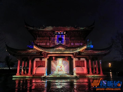 在万善阁投影部分,万善阁高13米,宽19米,飞檐反宇,精巧工整,是中国传统楼阁的建筑样式。投影设计中要解决的是不规则的投影载体成像,与楼阁本身颜色偏差大带来的问题。因此,针对阁楼主体,赢康采用数台科视HS系列投影机进行融合投影。
