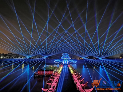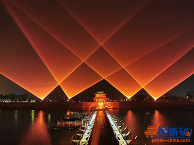 在堤岸和浮桥投影部分,设计上采用了跨江投影,投影机被安装在170米宽的江对岸,分别投射两侧堤岸与浮桥三处画面。