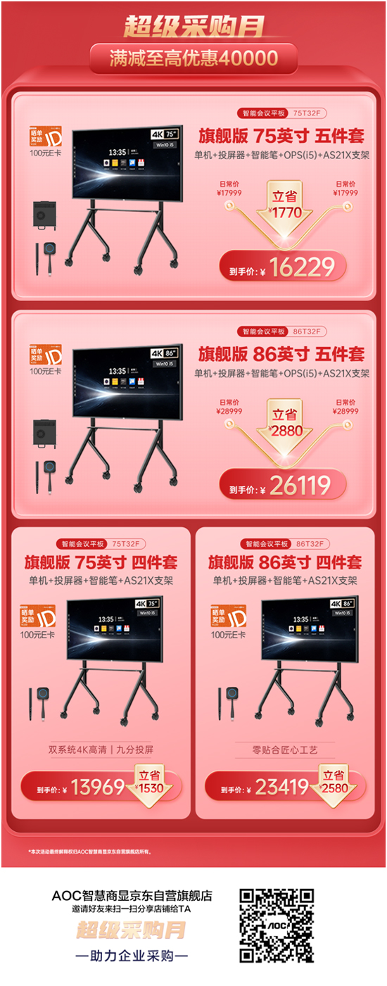 即日起至7月15日,AOC“超级采购月”活动再度来袭,部分会议平板产品每满300元减30元,满减优惠至高40000元,晒单更有京东E卡相送,钜惠盛袭不容错过!