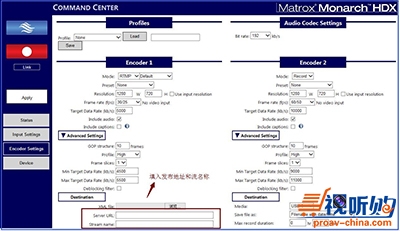 1.打开Matrox硬件编码器的管理页面,设置好网络,填写好直播流的RTMP发布地址和流名称。