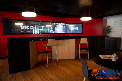 Santander WorkCafé 是位于智利的一类银行分行机构,它将普通的银行分行区域转化成了一片社区空间:一半为银行而另一半为咖啡馆。目前已有20家Santander分行应用了该模式,并将于2018年年底前引入20间办公室。自助服务机和视频墙内集成安装了Zytronic 的触控传感器,它们是每一家Santander WorkCafé的主要元素。