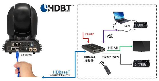 另外一种简化布线、部署便捷的HDBaseT方案也非常适合在大面积报告厅使用,利用HDBaseT(云台摄像机、接收器),通过一根网线即可传输音视频、控制信号、IP流、电源,突破传统方案的100米限制。