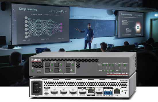 Extron 全新推出的 DTP3 CrossPoint 42 是一款尺寸为 4x2 的紧凑型 4K/60 矩阵切换器。它支持 USB-C® 和 HDMI 输入,以及 HDMI 和 DTP3 输出,可通过单根 CAT 6A 屏蔽电缆传输视频、音频及控制信号至 100m (330') 远的距离。60W USB-C 充电和音频解嵌等集成友好特性可有效简化系统设计部署,减少设备需求,从而大大提升安装效率。Extron 专有的 Vector™ 4K 图像解析度转换技术可实现卓越的图像品质,无缝切换效果及徽标键入。上述诸多功能特性使得 DTP3 CrossPoint 42 成为会议室、协作空间、培训室及其他专业视音频演示场馆的理想之选。