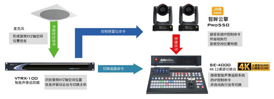 从声音定位→智能追踪→信号调度→专业输出,智眸云擎Pro550、VTRX-100、SE-4000 与吸顶麦四方协同,构建完整的全链路 4K 智能声像追踪系统。