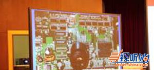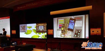 会场正中多屏多画面光学正投融合拼接系统,色彩清新亮丽。这套系统采用了:dnp Supernova Infinity屏幕 84” 1*2,2台DS+10K-M投影机以及Extron MGP 464W WindoWall™ 系统可扩展的多图像拼接墙处理器系统。