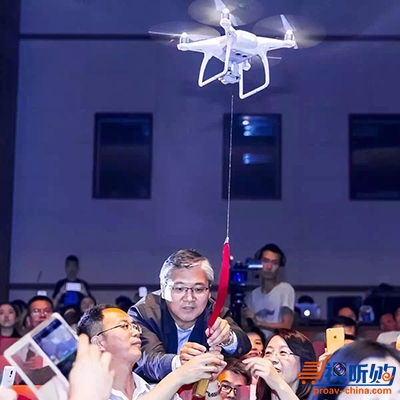 无人机“亦庄号”从舞台空中,将科技文化融聚未来之门的金钥匙送达。