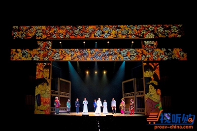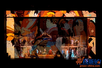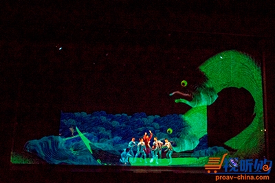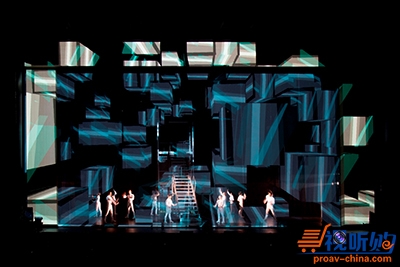 视频会投影到舞台背景上。表演和舞蹈场面与投影在逼真透明的屏幕上的3D画面上相协调。同样包括投影在墙壁上的视频画面,会随着表演顺序呈现出动态变化。