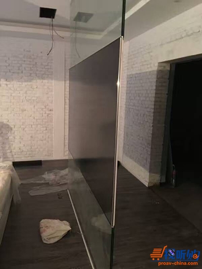 屏幕的背面,客户大胆采用一块与屏幕同宽的巨面玻璃墙设计,同时负责屏幕的承重,玻璃厚度为3cm。这样,他设计的空间看上去更开阔,延伸空间感之余,更添浮空飘渺的美。