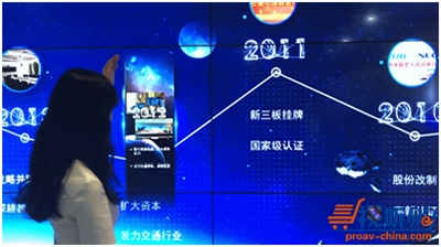 另一种是通过人体移动及动作指示实现与拼接墙上内容的互动,例如在展示页面时间轴上挥一挥手就可以打开当年公司的大事记。