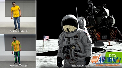 参观者一到NVIDIA展台就能看到一个具有历史意义的熟悉场景:一名宇航员站在阿波罗11号着陆器旁。这一渲染而来的场景让登月这一历史性时刻重现。但是,再走近些,他们就会注意到宇航员动了起来,而且正是在模仿自己的动作。