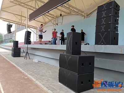天气非常闷热的7月28号早晨8点,曾参与去年首期研修班的音响技师吴晨与学校教师和部分技师学员到现场开始安装调试点声源扩声系统及线性阵列扩声系统(台上、台下落地安装)直到午后调试完毕。