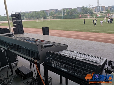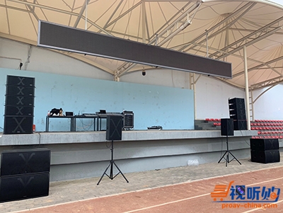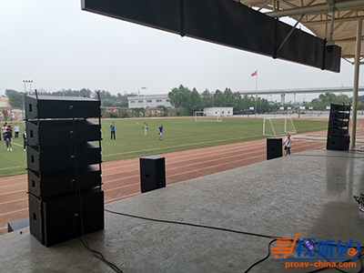 在体育场装了2只全频点声源音箱,2只双18吋超低音箱(分频点88Hz);两组线阵音箱(4只双10吋全频+1只18吋低音),2只双18吋超低音箱;听音直线距离86米。