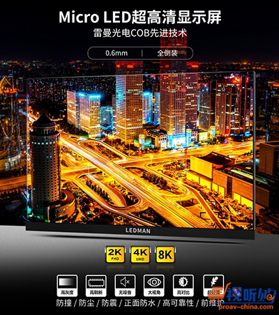雷曼新一代基于COB技术的超高清0.6mm间距Micro LED显示屏产品,仍然与上一代COB产品相同,采用显示单元拼接方式,可以无限拼接形成各种尺寸的显示屏。雷曼也提供标准尺寸的0.6mm间距Micro LED显示产品,包括54吋的2K Micro LED显示屏、108吋的4K Micro LED显示屏,以及216吋的8K Micro LED显示屏产品,与雷曼2019年7月发布的0.9mm间距的324吋8K Micro LED相比,0.6mm间距的216吋的8K Micro LED显示产品,技术更加先进。