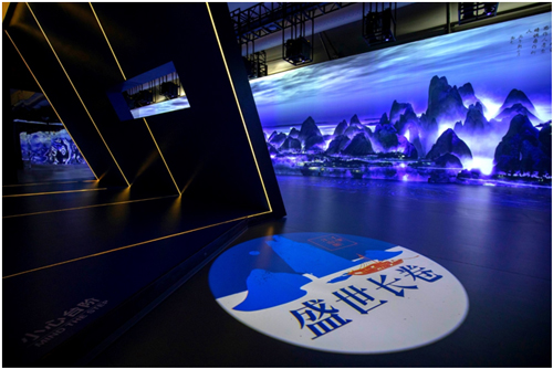 本次展馆以宋代名画《千里江山图》为基础,融入重庆本土文化元素,共分八个单元。设计团队以数字投影、虚拟影像、互动捕捉等方式,将画卷再次重新创作,达到三维空间的立体效果。巴可投影承担了“盛世长卷”、“丹青剧场”两大核心单元的视觉呈现,提供沉浸式数字光影的文化空间。