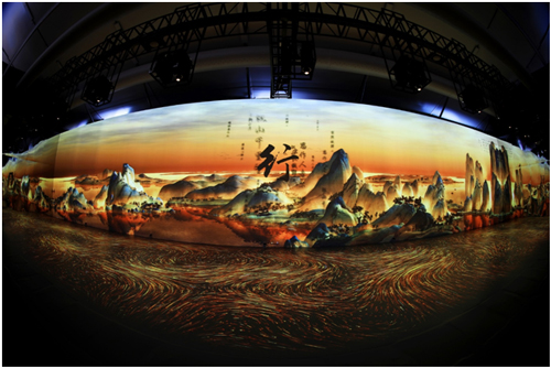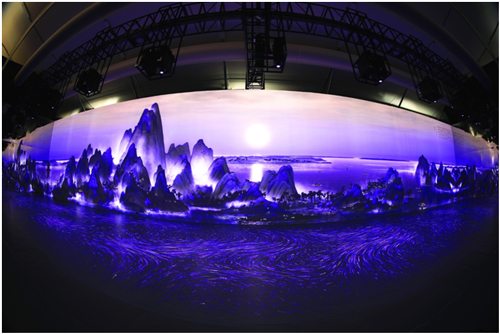 “丹青剧场”是展馆内最大的弧面环幕单元,机位和成像距离相比“盛世长卷”的场景更为复杂。对于同一型号的投影机而言,环幕场景需要较高的适配性。