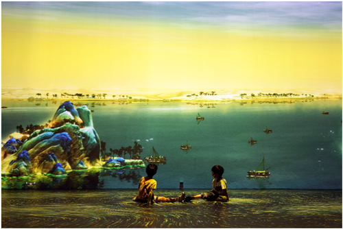 “盛世长卷”是展馆最大的独立单元,采用22台巴可G60系列投影机。以11x2的组合方式直线排列,墙面和地面相呼应,地面配合红外设备与观众实时互动。